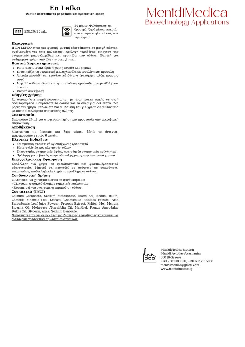 Η En Lefko προάγει δυνατά δόντια, υγιή ούλα και δροσερή αναπνοή, αποτελώντας την ιδανική επιλογή για όσους αναζητούν μια φυσική, επιστημονικά τεκμηριωμένη λύση στη στοματική τους φροντίδα.